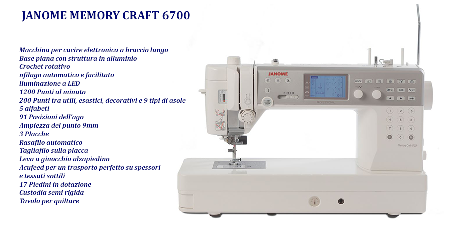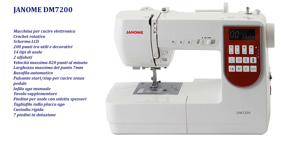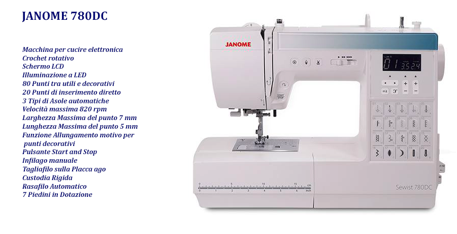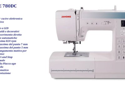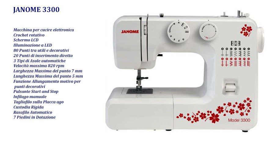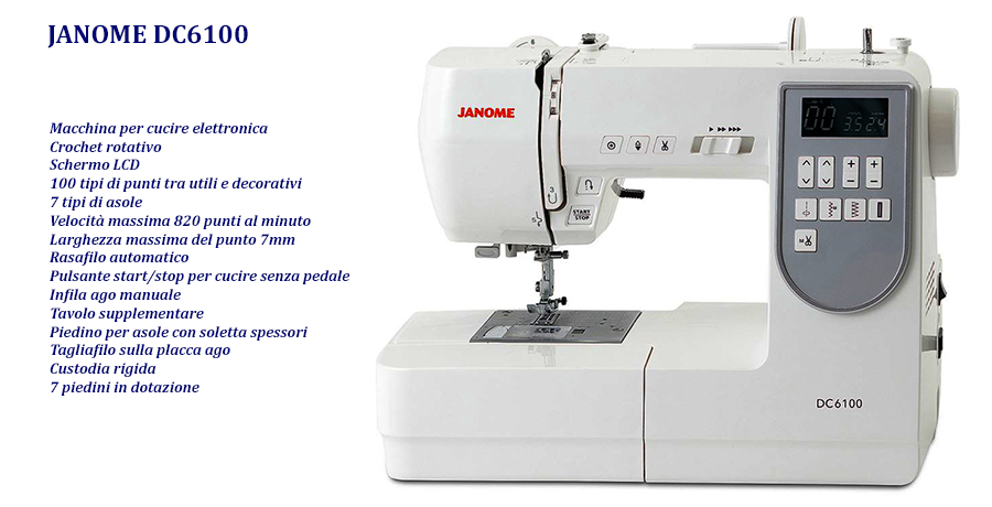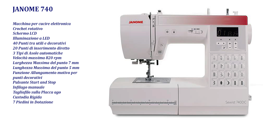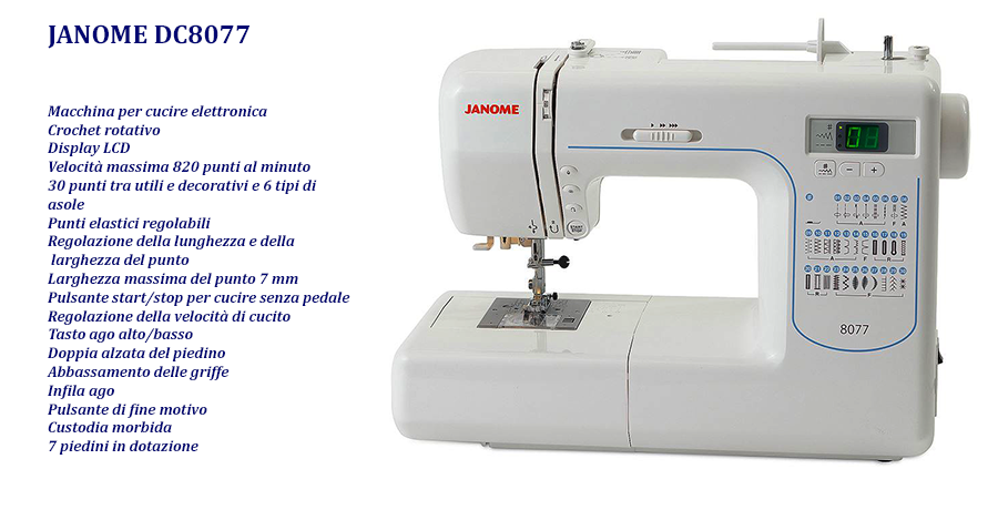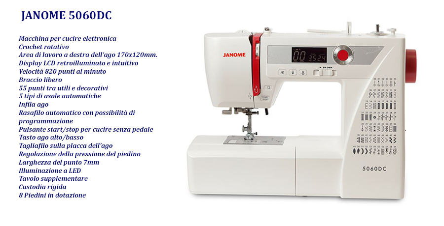Macchina per cucire elettronica, crochet rotativo, area di lavoro a destra dell’ago 170x120mm, display LCD retroilluminato e intuitivo, velocità 820 punti al minuti, braccio libero, 55 punti tra utili e decorativi, 5 tipi di asole automatiche, infila ago, rasafilo automatico con possibilità di programmazione, pulsante start/stop per cucire senza pedale, tasto ago alto/basso, tagliafilo sulla placca dell’ago, regolazione della pressione del piedino, larghezza del punto 7mm, illuminazione a LED, tavolo supplementare, custodia rigida e 8 piedini in dotazione
