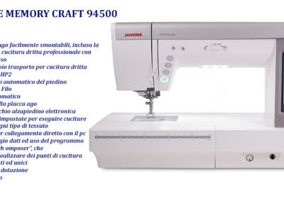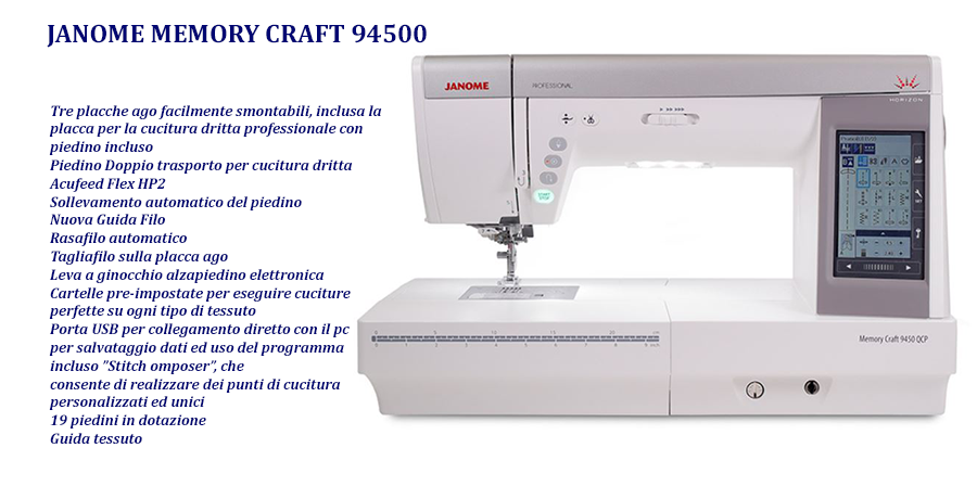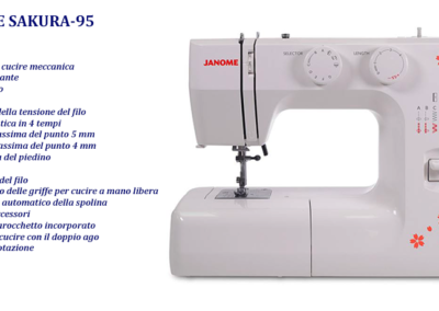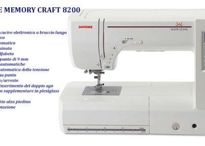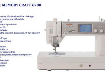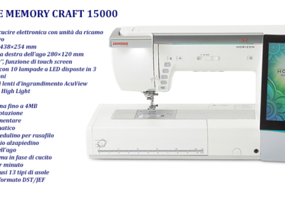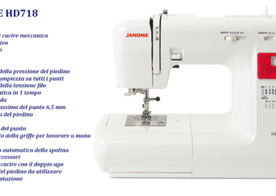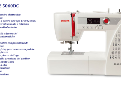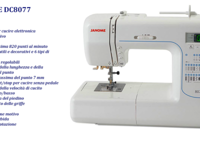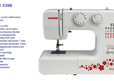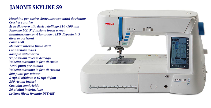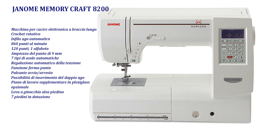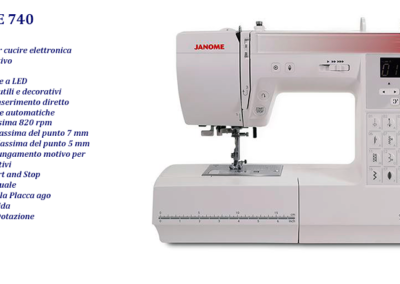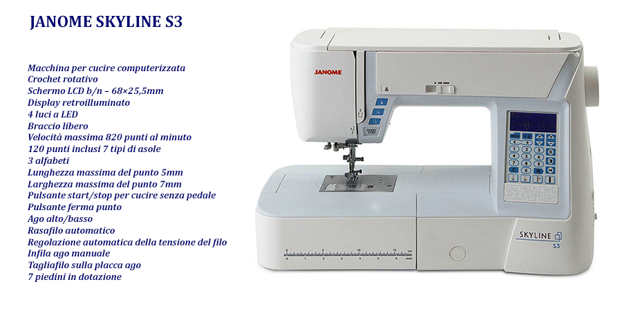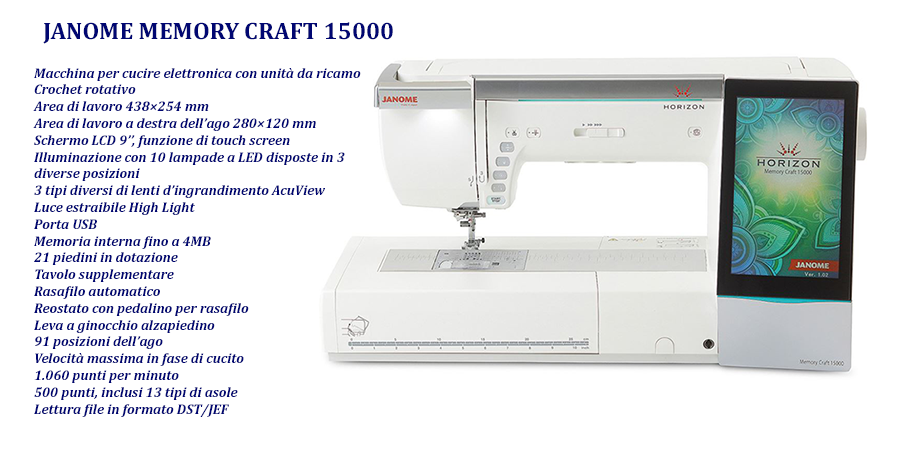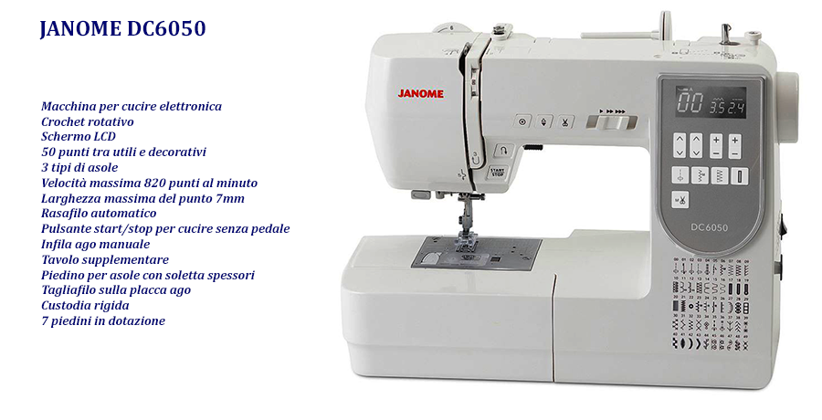Macchina per cucire elettronica, crochet rotativo, area di lavoro a destra dell’ago 170x120mm, display LCD retroilluminato e intuitivo, velocità 820 punti al minuti, braccio libero, 55 punti tra utili e decorativi, 5 tipi di asole automatiche, infila ago, rasafilo automatico con possibilità di programmazione, pulsante start/stop per cucire senza pedale, tasto ago alto/basso, tagliafilo sulla placca dell’ago, regolazione della pressione del piedino, larghezza del punto 7mm, illuminazione a LED, tavolo supplementare, custodia rigida e 8 piedini in dotazione