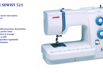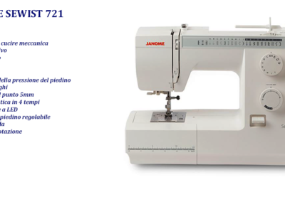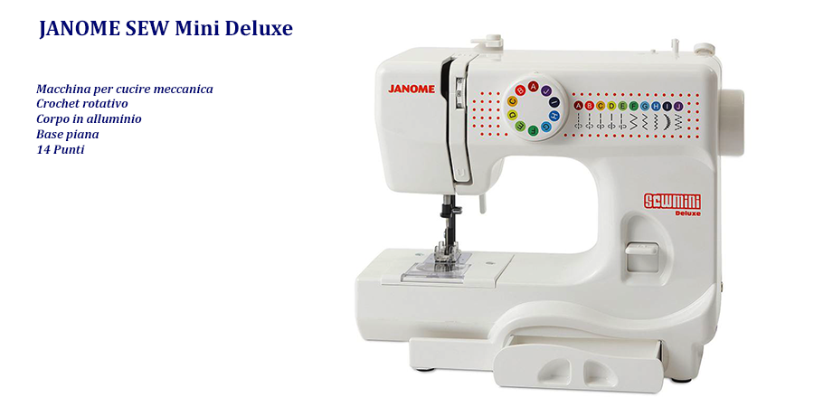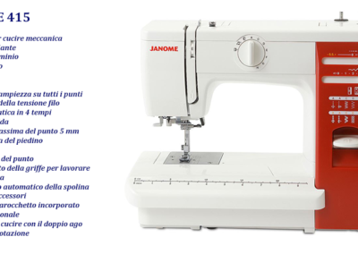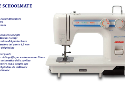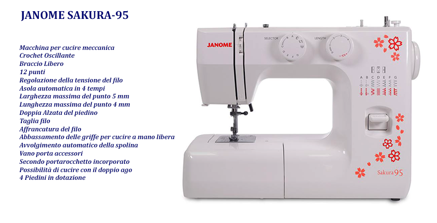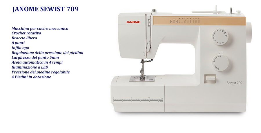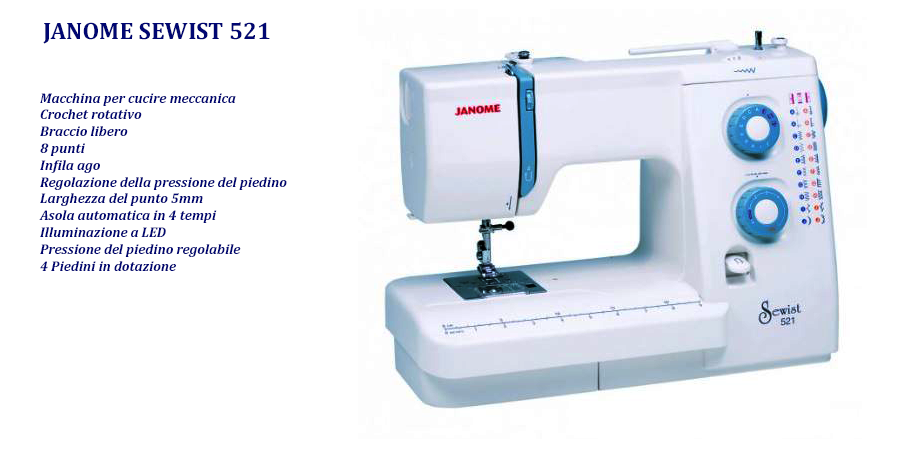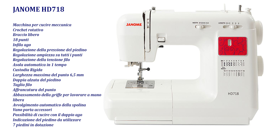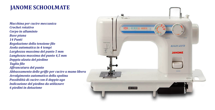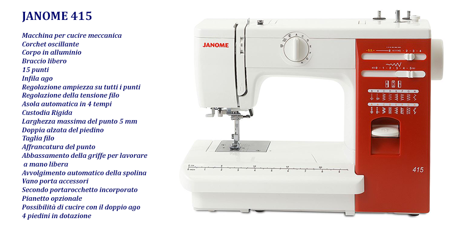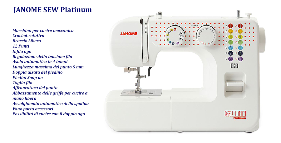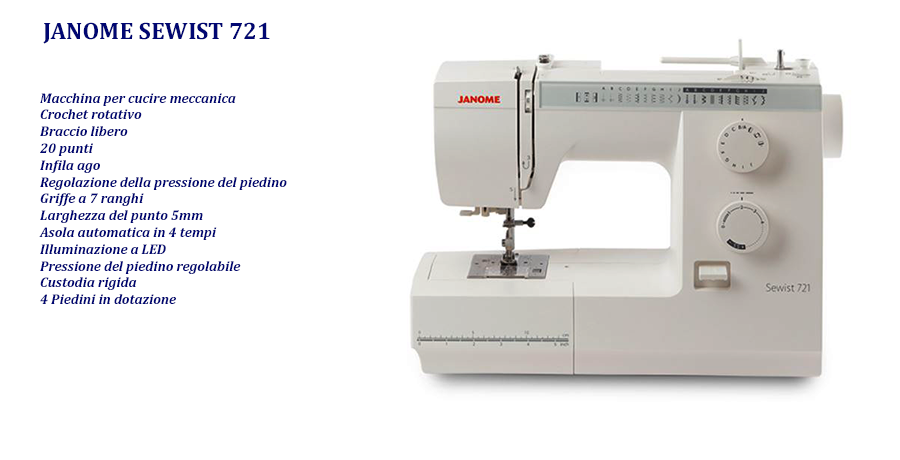 Macchina per cucire meccanica, crochet oscillante, braccio libero, 12 punti, infila ago, regolazione della tensione del filo, asola automatica in 4 tempi, larghezza massima del punto 5mm, doppia alzata del piedino, taglia filo, affrancatura del punto, abbassamento delle griffe per cucire a mano libera, avvolgimento automatico della spolina, vano porta accessori, secondo portarocchetto incorporato, possibilità di cucire con doppio ago e 4 piedini in dotazione